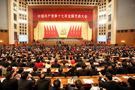 10月21日九時,中國共產(chǎn)黨第十七次全國代表大會閉幕會開始在北京人民大會堂舉行。