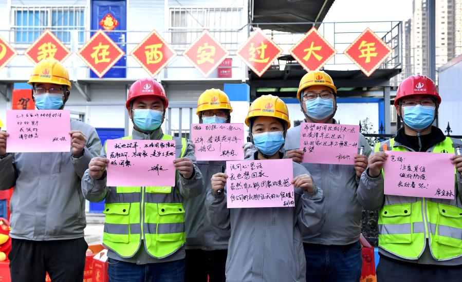 2月1日,在西安中天西北集團一住房項目建設工地,建設者寫下自己想對家人說的話。新華社記者 劉瀟 攝