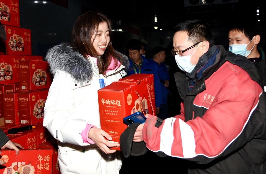 1月31日,北京昌平的一家民營企業(yè)糧食蔬菜倉儲車間內,留守崗位、“就地過年”的員工(右)在領取春節(jié)慰問品。新華社記者 潘旭 攝