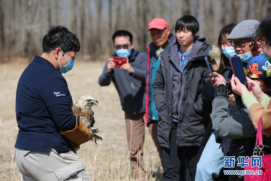 3月20日,北京猛禽救助中心猛禽康復(fù)師周蕾在放飛大鵟前向參加放飛活動的人員進(jìn)行講解、展示。新華社記者 李京 攝