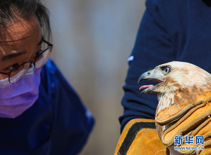 3月20日,北京猛禽救助中心猛禽康復(fù)師戴暢在放飛大鵟前進行最后的檢查。新華社記者 李京 攝