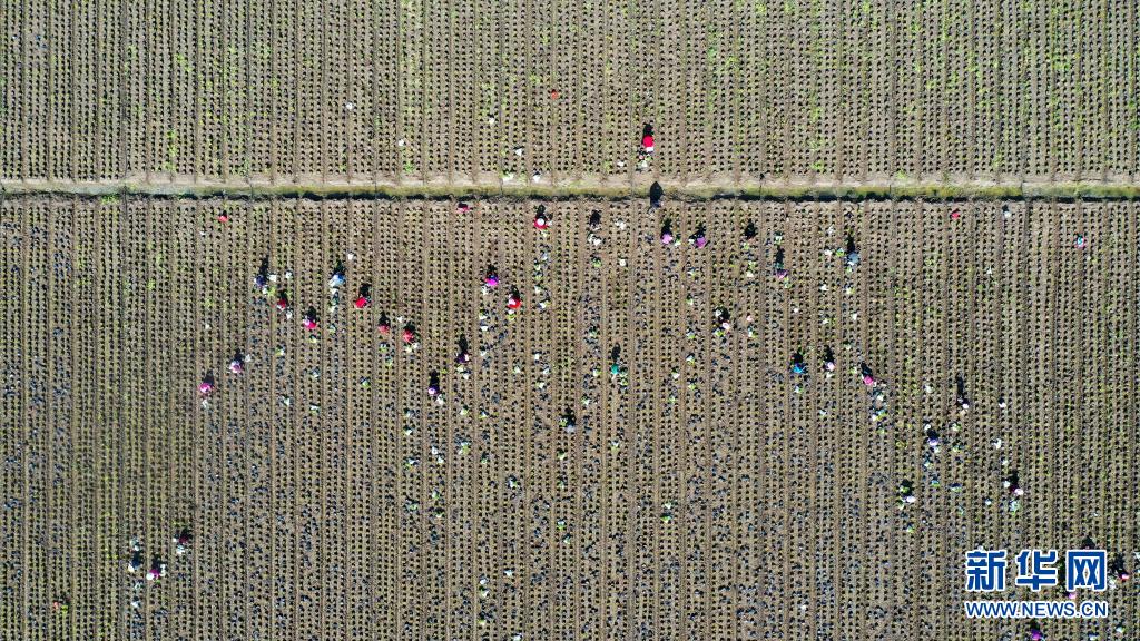 4月5日,江蘇省宿遷市沭陽縣劉集鎮(zhèn)南長莊村農(nóng)民在田間勞作(無人機(jī)照片)。