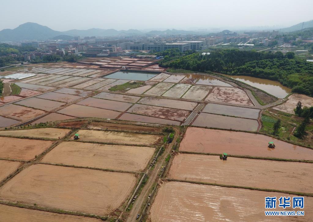 4月6日,浙江省金華市武義縣白洋街道沈宅村農(nóng)民駕駛農(nóng)機(jī)在田間插種早稻(無(wú)人機(jī)照片)。