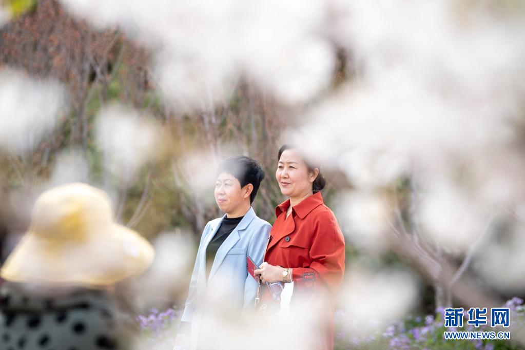 4月7日,游人在山西省太原市玉泉山城郊森林公園拍照留念。近日,山西省太原市玉泉山城郊森林公園栽植的近25萬株各類櫻花競相盛開,吸引不少市民前來觀賞。新華社記者 楊晨光攝