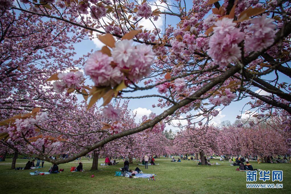 4月20日,人們?cè)诜▏屠杞嫉膰t公園欣賞櫻花。