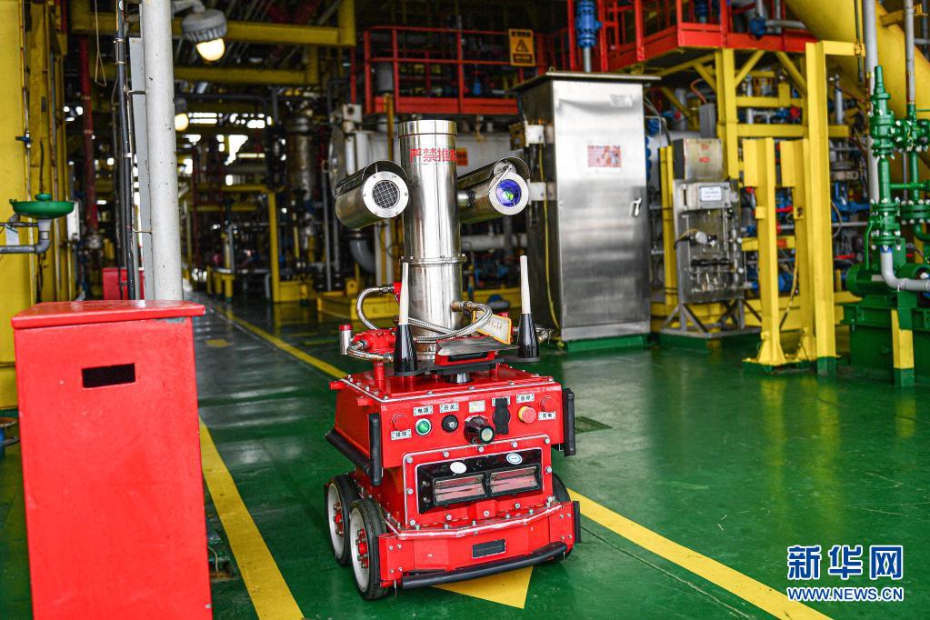 4月25日,巡檢機(jī)器人在中國(guó)海油樂(lè)東15-1氣田上進(jìn)行巡檢作業(yè)。