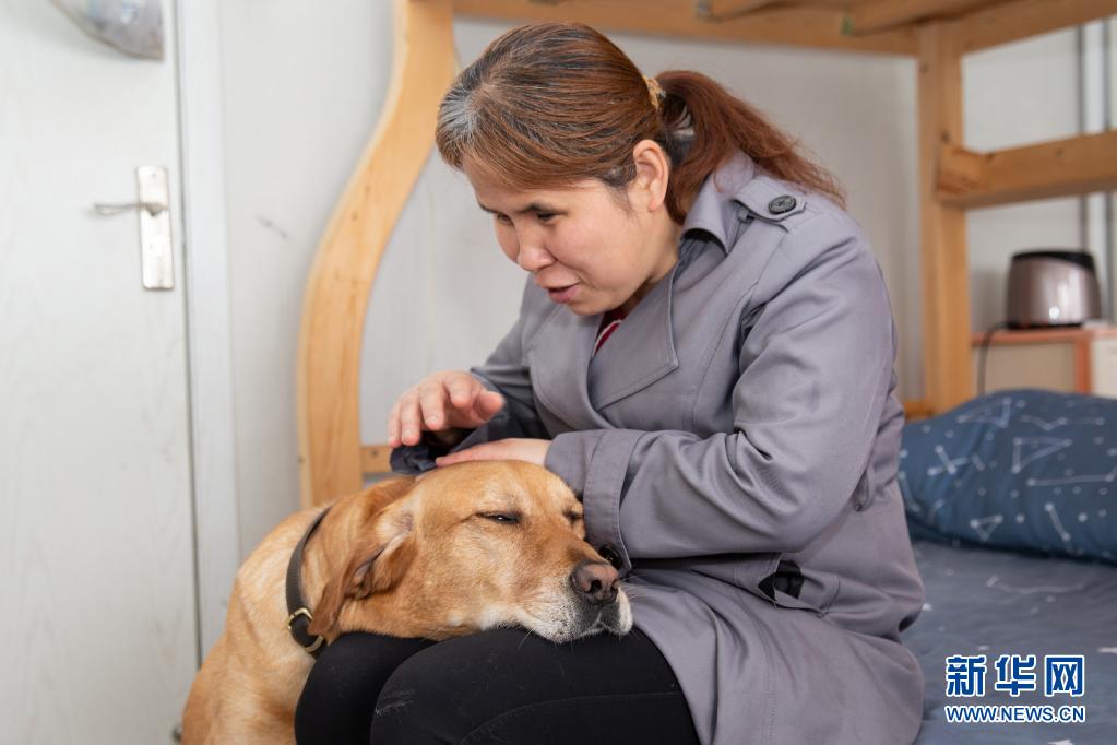導盲犬“多多”經常會把頭放在祝愛葉腿上,祝愛葉一邊撫摸著它的頭一邊和它說說心里話(4月26日攝)。 新華社發(fā) (張夢 攝)
