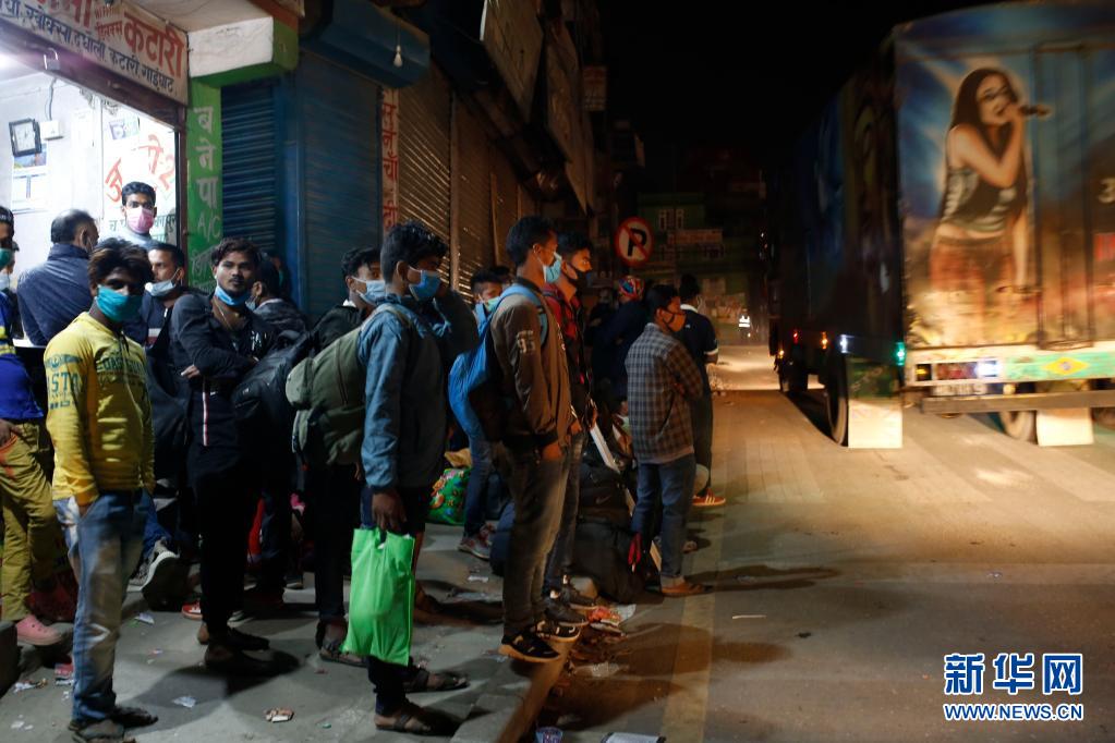 4月28日晚,人們在尼泊爾首都加德滿都的路邊等車,準(zhǔn)備在封禁措施實(shí)施前離開加德滿都返回家鄉(xiāng)。