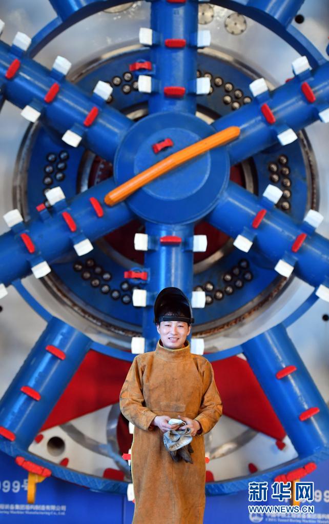 王安永在中鐵工程裝備集團車間與盾構(gòu)機合影(4月23日攝)。