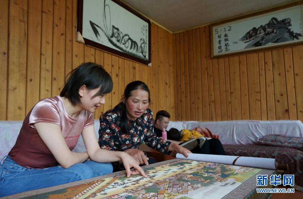 5月6日,李蕓香(左二)給女兒林苓介紹她花4年時(shí)間繡的《清明上河圖》十字繡作品。 新華社記者 江宏景 攝