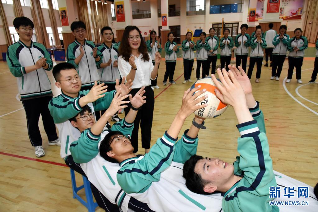 5月23日,青島通濟(jì)實驗學(xué)校高三學(xué)生在進(jìn)行“躺椅傳球”游戲。