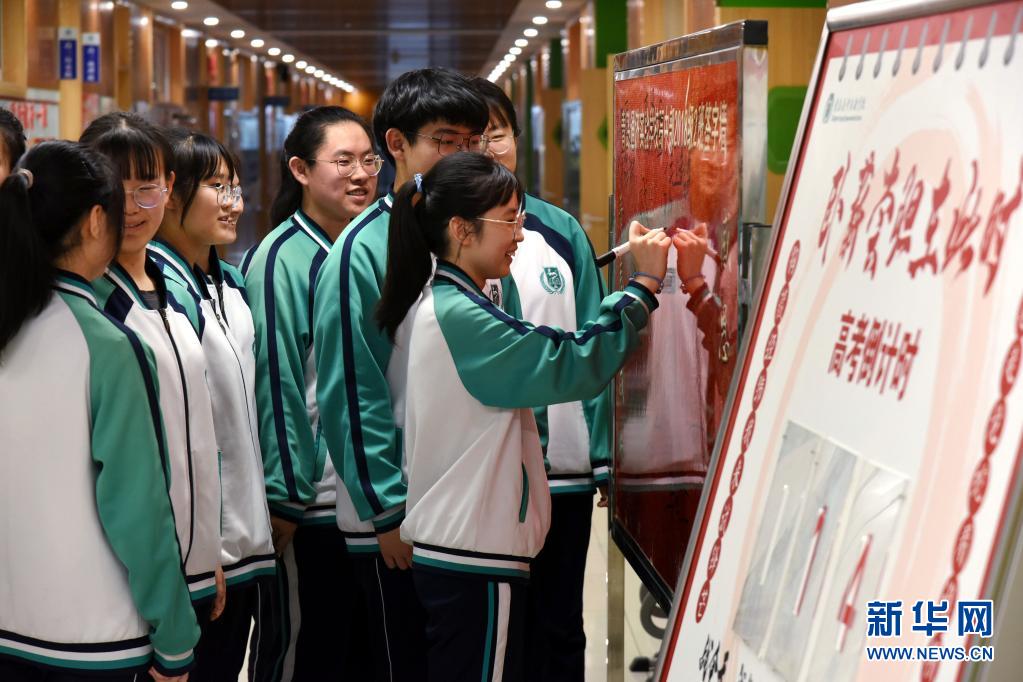 5月23日,青島通濟(jì)實驗學(xué)校高三學(xué)生在簽名板上留言相互鼓勵。