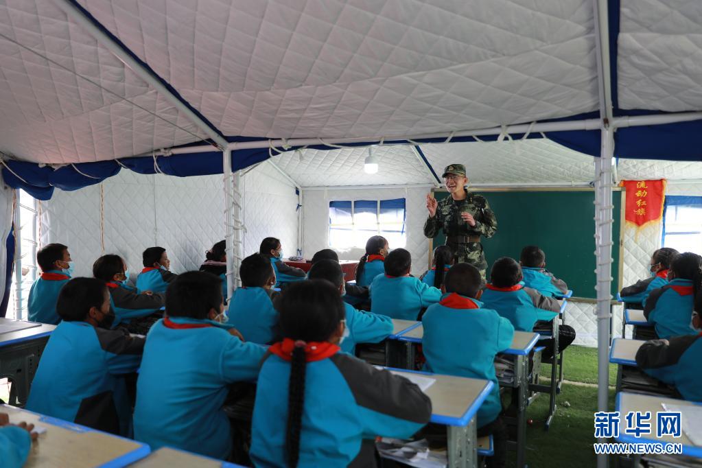 5月24日,武警青??傟牴逯ш牂C(jī)動大隊排長張國睿為花石峽鎮(zhèn)藏文中心寄宿制小學(xué)的孩子上課。新華社記者 劉新 攝