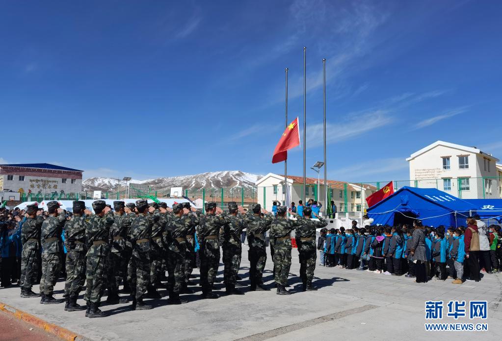 5月24日,武警青??傟?duì)果洛支隊(duì)機(jī)動大隊(duì)官兵與花石峽鎮(zhèn)藏文中心寄宿制小學(xué)的師生一同參加升國旗儀式。新華社發(fā)(宦爵才郎 攝)