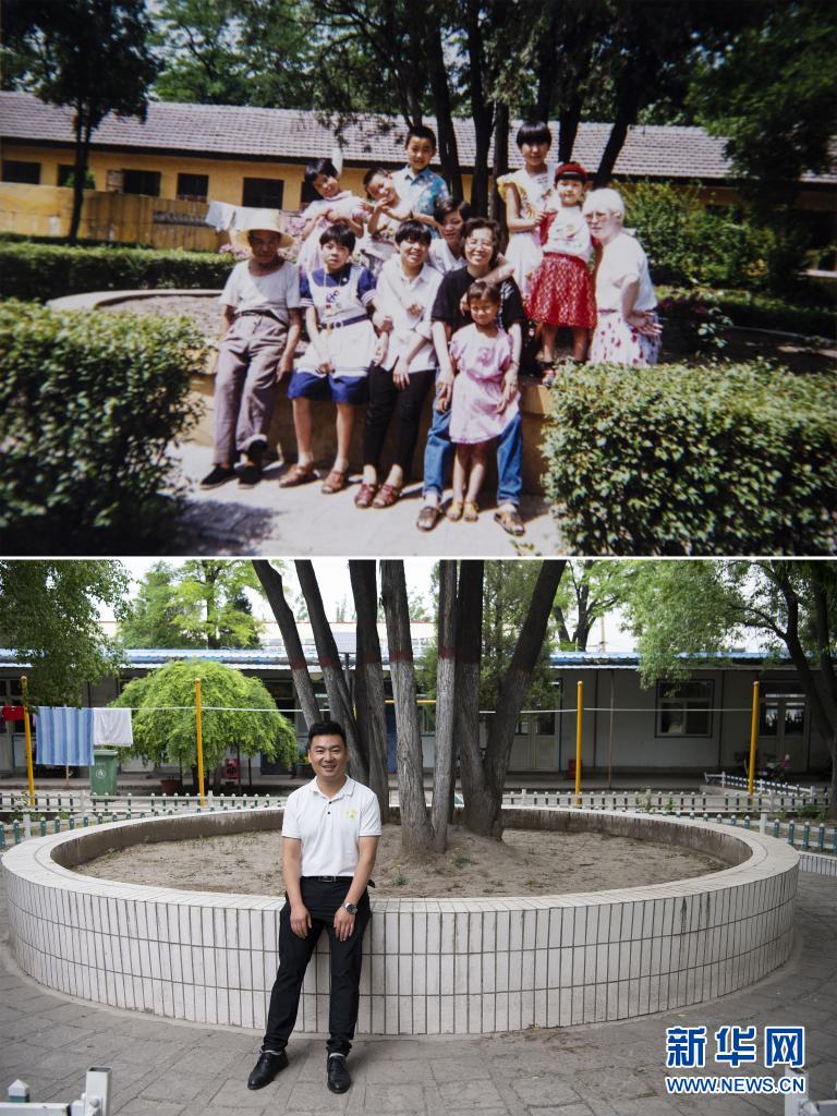 這是一張拼版照片,上圖為:童年時(shí)期的黨龍祥(后排左二)在太原市社會(huì)(兒童)福利院留影(資料照片,受訪(fǎng)者供圖);下圖為:5月31日黨龍祥在太原市社會(huì)(兒童)福利院留影(新華社記者楊晨光攝)。