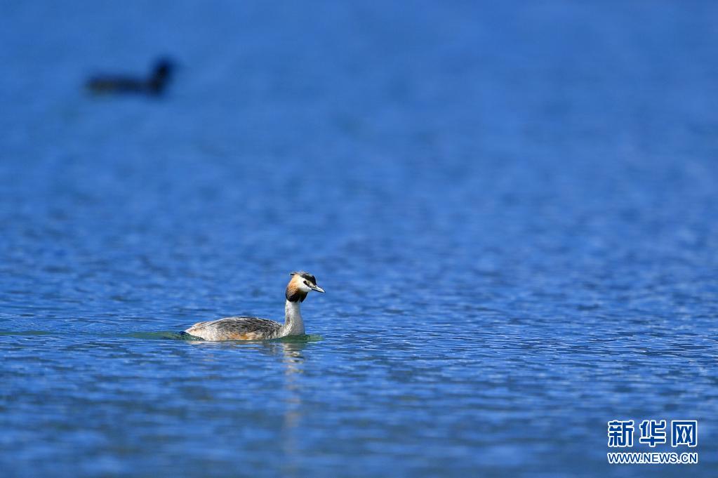 6月14日在拉魯濕地拍攝的鳳頭??。夏日里,鳳頭??和小??在西藏拉薩拉魯濕地國(guó)家級(jí)自然保護(hù)區(qū)水面上嬉戲。新華社記者 張汝鋒 攝