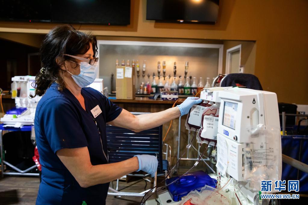 6月14日,在美國紐約州長島地區(qū)的貝肖爾,工作人員在美國紐約血液中心舉行的獻(xiàn)血活動上處理采集的血液。