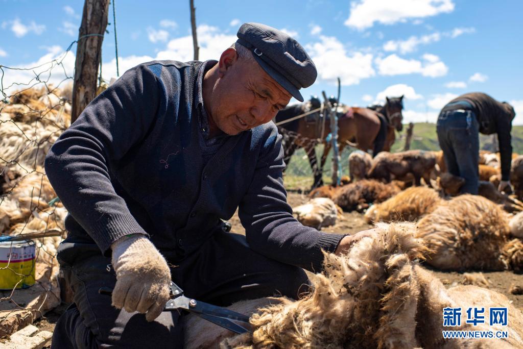 新疆裕民縣的牧民在巴爾魯克山區(qū)夏牧場上剪羊毛(6月15日攝)。