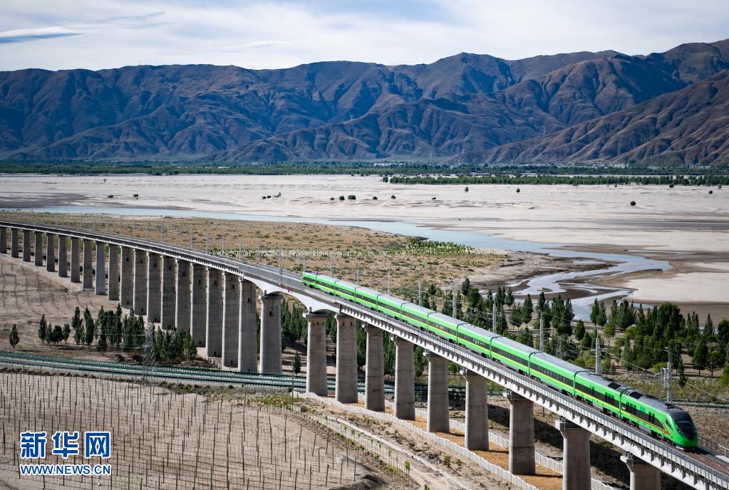 試運(yùn)行的復(fù)興號(hào)列車(chē)行駛在雅魯藏布江畔(6月16日攝)。
