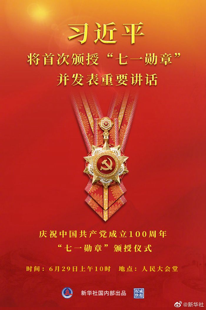 慶祝中國共產(chǎn)黨成立100周年“七一勛章”頒授儀式將于29日上午10時(shí)在人民大會堂隆重舉行。習(xí)近平為“七一勛章”獲得者頒授勛章并發(fā)表重要講話。