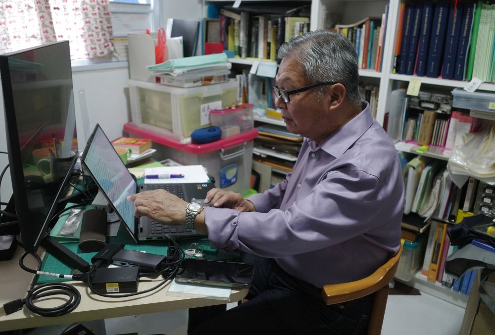 2025年8月23日,新加坡学者林少彬在位于新加坡的家中查看资料。(舒畅 摄)