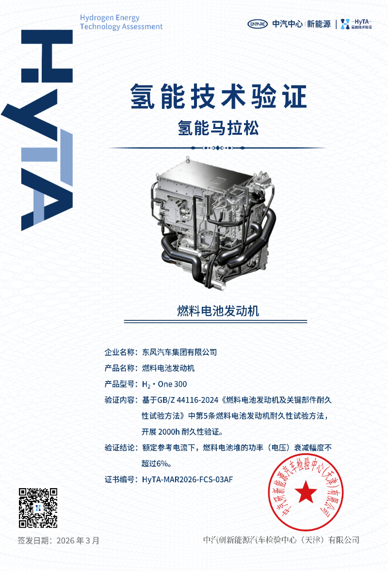 东风H₂・Core 350电堆、H₂・One 300系统荣获HyTA验证证书