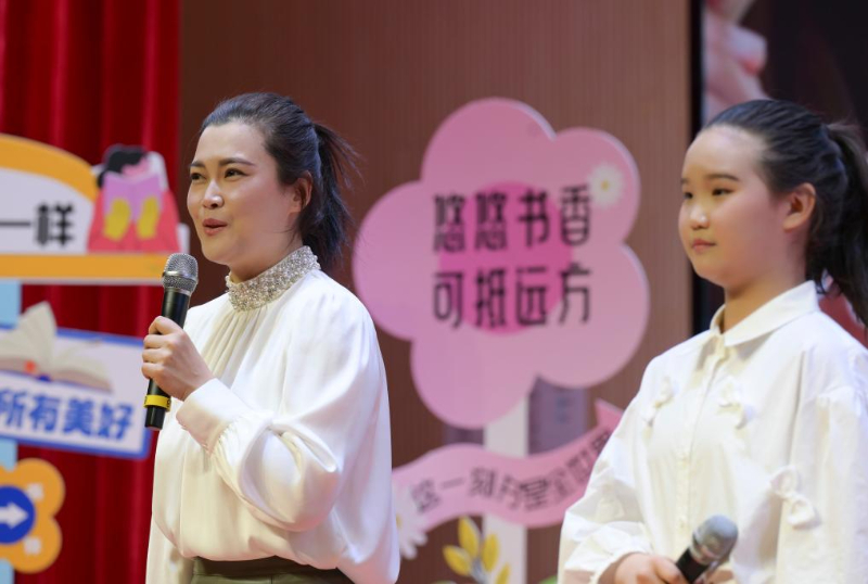 3月27日,新疆教育学院实验小学四年级学生许濯缨(右)与妈妈马若飞在活动中分享阅读后的心得体会。