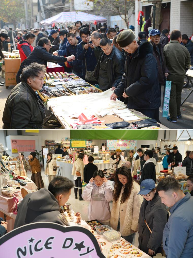 拼版照片:上图为游客在位于西安市莲湖区的老西仓市集上选购商品(2016年12月1日摄);下图为游客在改造后的西安西仓市集文创公园一处市集上选购商品(2025年12月6日摄)。