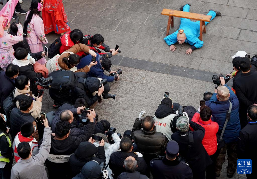 2月6日,社火团队的演员在庙会上表演舞狮(无人机照片)。