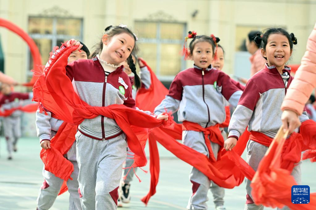 2月21日,小朋友在石家庄市第一实验幼儿园扭秧歌。