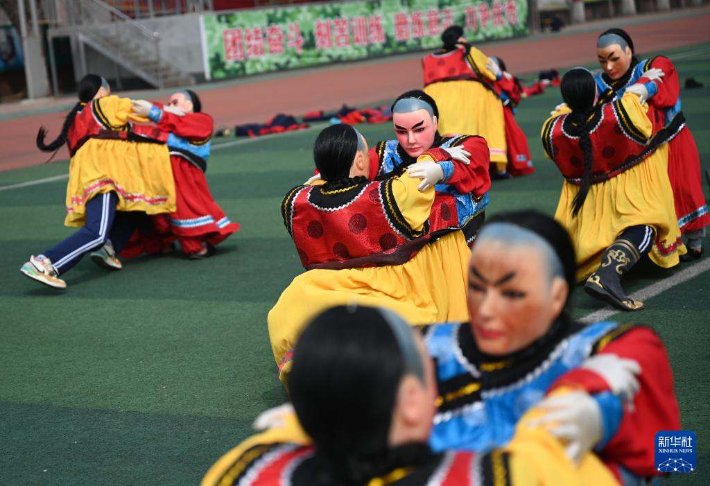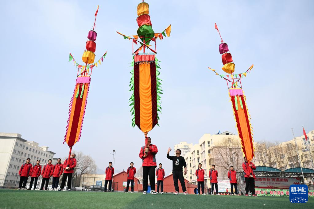 3月20日,隆化县职教中心学生在练习河北省级非遗项目“隆化中幡”。