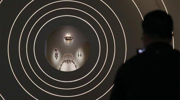 4月14日,在河南省汝州市一家汝瓷展厅内,工作人员在查看汝瓷产品。