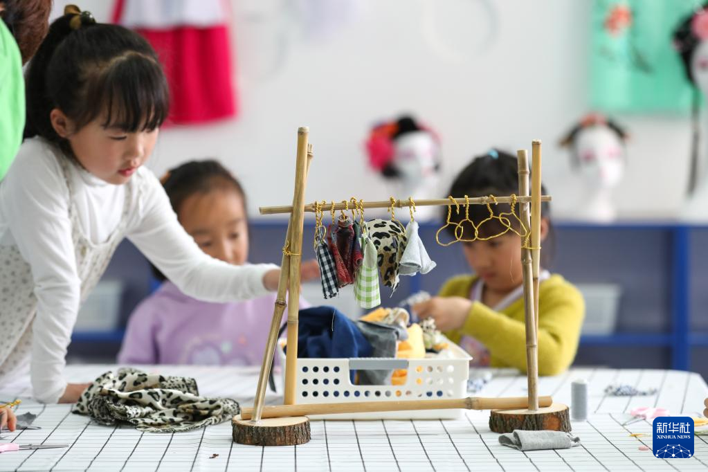 4月20日,小朋友们在给木偶玩具制做服饰。