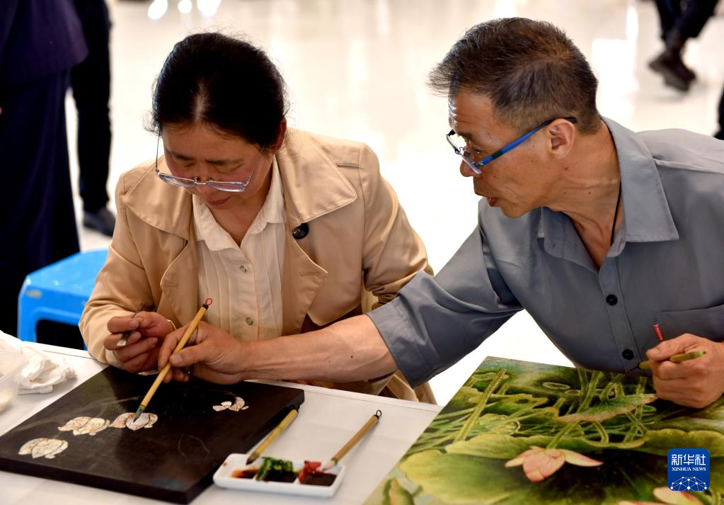 5月6日,游客在江苏省扬州市江都区万达广场的非遗文化展示区向国家级非遗项目扬州漆器髹饰技艺师学习漆器髹饰技艺。