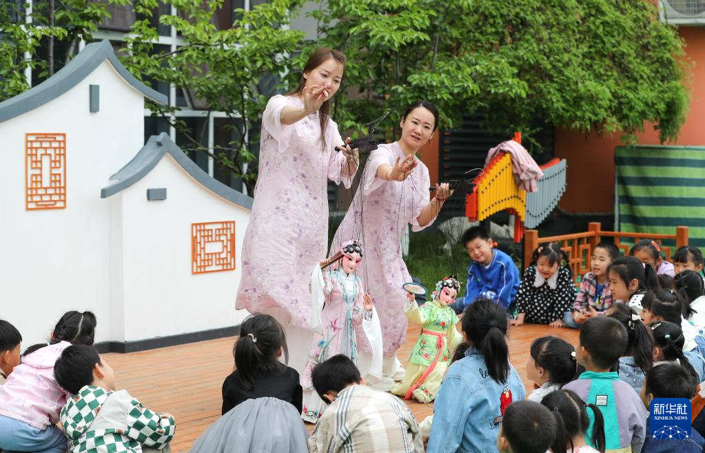 孙菁(右)、施锦芳在七都幼儿园为小朋友表演木偶昆曲(4月20日摄)。