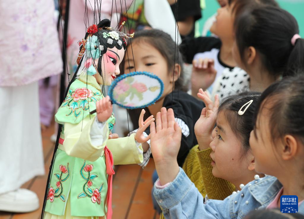 在七都幼儿园,小朋友与提线木偶互动(4月20日摄)。