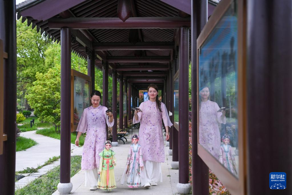 孙菁和施锦芳在苏州市吴江区七都镇一处公园内进行排练(4月18日摄)。他们手提十多根线操纵着约六十厘米高、七八斤重的木偶,通过手指、形体动作来操控木偶的动作神态。