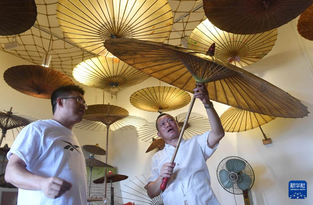 6月1日,在广西宾阳县宾州镇陆村,陆云岗(右)在介绍油纸伞制作技艺。