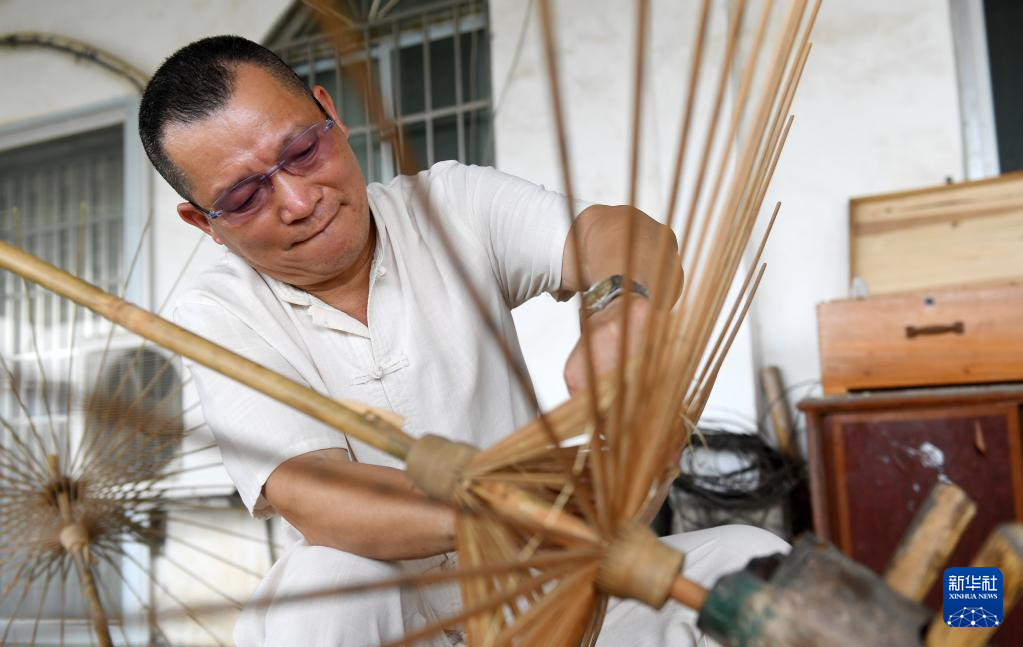 6月1日,在广西宾阳县宾州镇陆村,陆云岗在制作油纸伞。