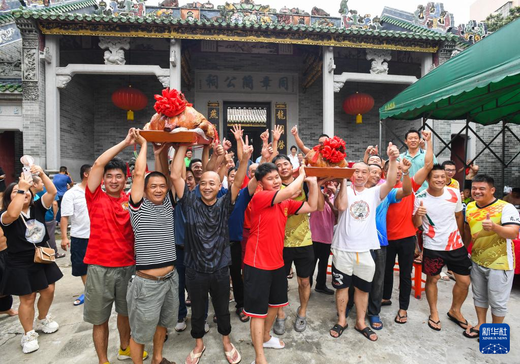 6月15日,2023年车陂龙舟竞渡第一名“范阳简”龙船会的成员们在家祠前抬着奖品烧猪庆祝。