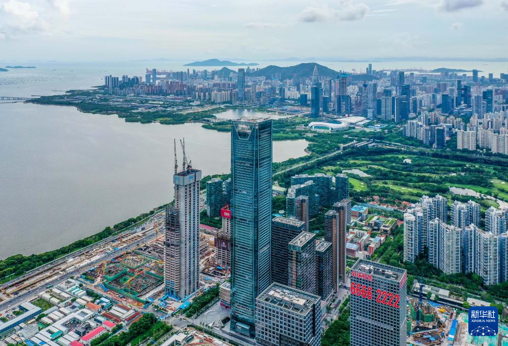位于深圳湾超级总部的深湾汇云中心(中)66层至79层是伍涛团队在打造装饰的一家国际著名品牌酒店(无人机照片,6月26日摄)。