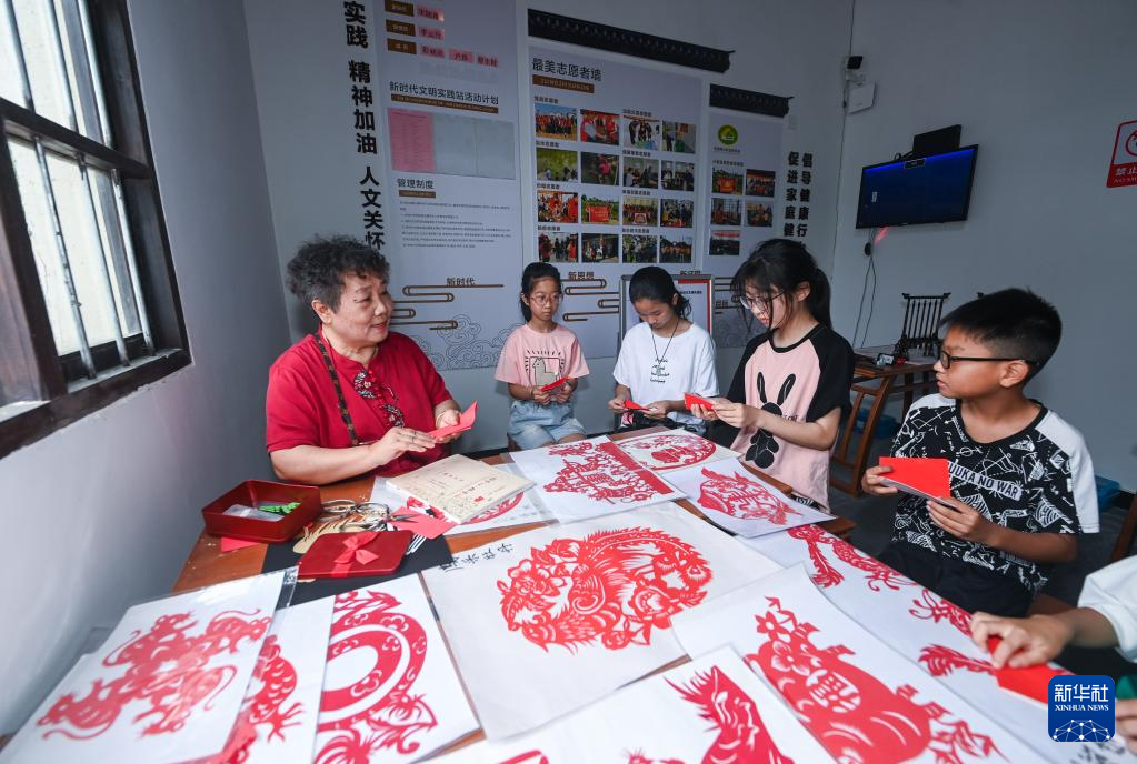 7月5日,剪纸老师在伍浦村文化礼堂内的暑期公益课堂教孩子们剪纸技艺。