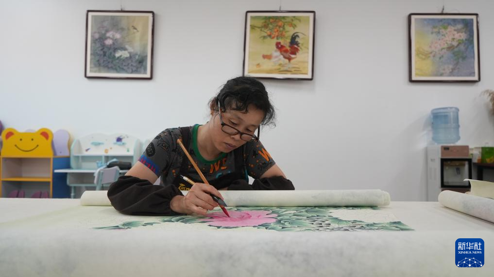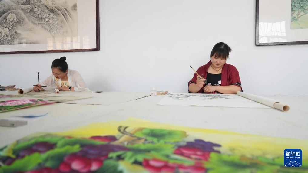 7月24日,画师在山东省巨野县永丰街道办事处洪庙村乡村画院绘制工笔画作品。