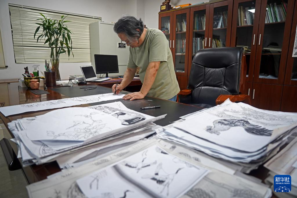 黄俊军在工作室里绘制铜雕草图(7月13日摄)。