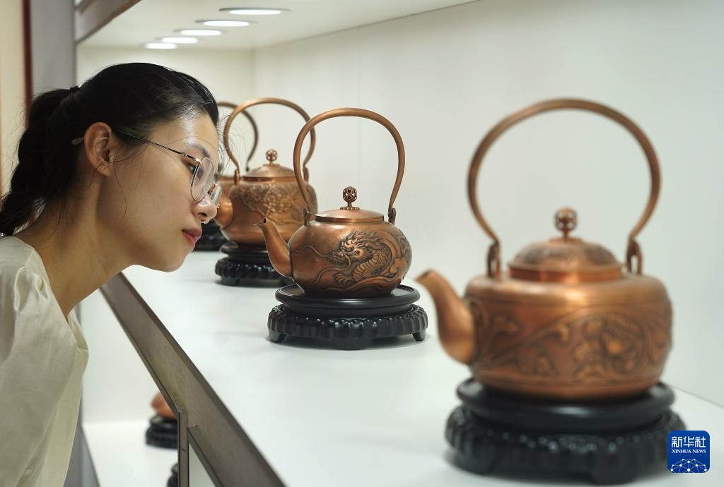 参观者在江西中鼎金属工艺有限公司的展厅里观赏铜壶工艺品(7月13日摄)。
