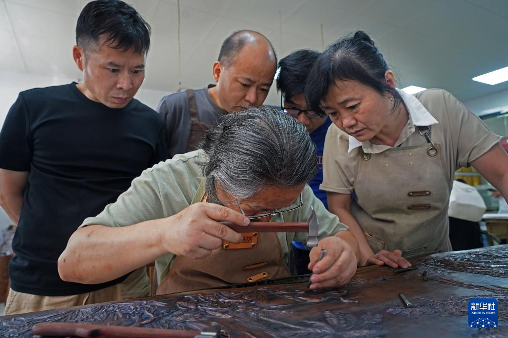 黄俊军(前)在给徒弟们演示铜雕技法(7月13日摄)。