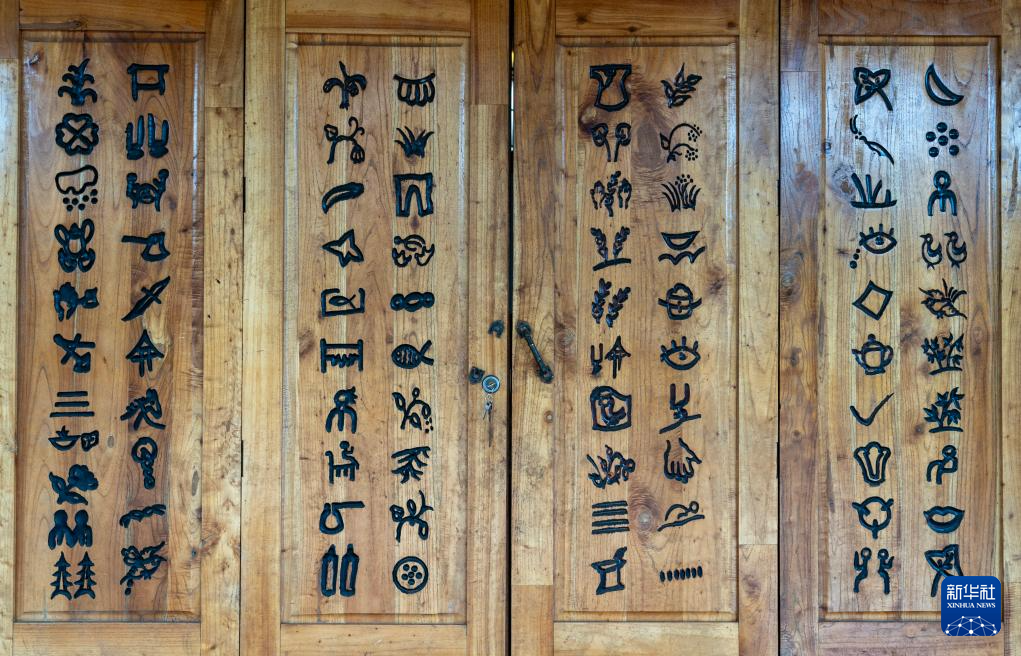 这是7月30日拍摄的刻在坡芽村坡芽传习馆门板上的81个“坡芽情歌”图画符号。