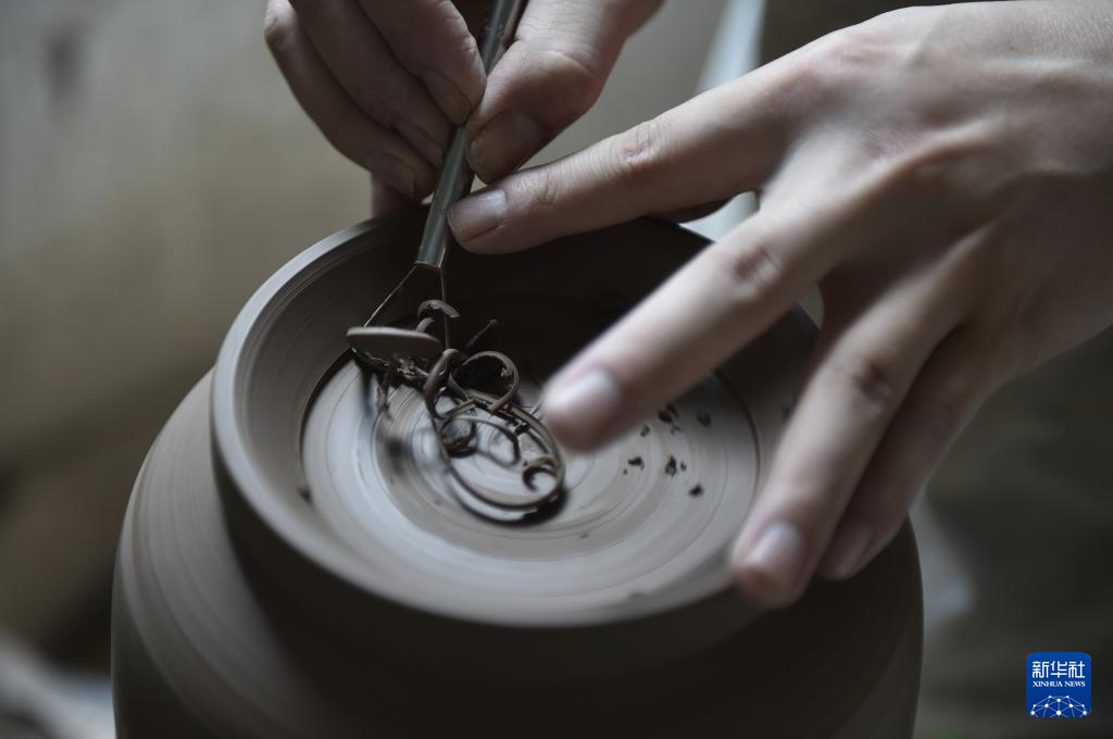 8月3日,在河南省禹州市神垕镇槐树湾村陶瓷创客基地,钧瓷艺人杨根成在自己的工作室里创作钧瓷作品。