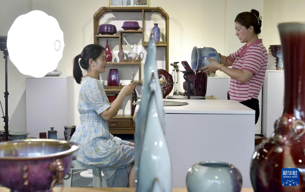 8月3日,河南省禹州市神垕镇一家钧瓷企业的工作人员通过手机直播销售钧瓷作品。