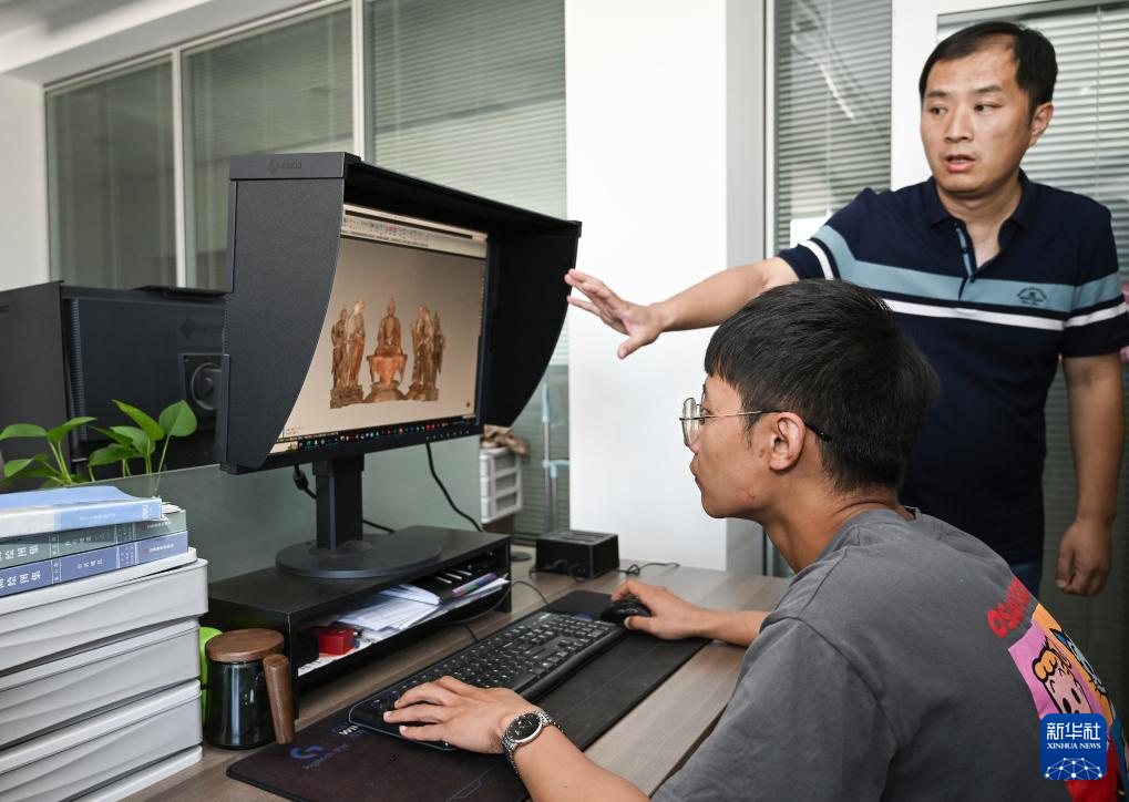 在敦煌研究院文物数字化研究所内,工作人员展示对莫高窟彩塑进行三维重建后的成果(8月3日摄)。